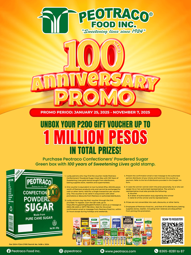 1. Lucky patrons who may find the voucher inside Peotraco Confectioners’ Powdered Sugar Green Box with 100 Years of Sweetening Lives gold stamp bought from distributors, baking supplies store, resellers and supermarkets.